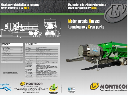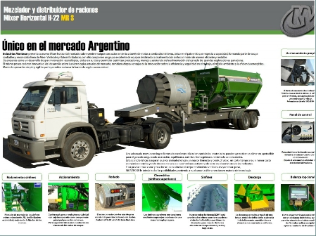 Mezclador y distribuidor de raciones capacidad 22m3 (volumen caja mezcladora). Sistema de mezclado a través de tres sin fines a paletas (dos superiores y uno inferior). Chasis construido con largueros paralelos de chapa acero mediante perfil I. Piso reforzado en espesor de chapa 5/16". Eje de ruedas tipo balancín con sistema de duales y con suspensión a ballestas semielípticas. Rodado 275/80 x 22.5 16T - Radiales. Accionamiento mediante Reductor Epicicloidal tipo PG 3502 con Caja D4A incorp.